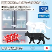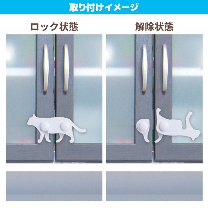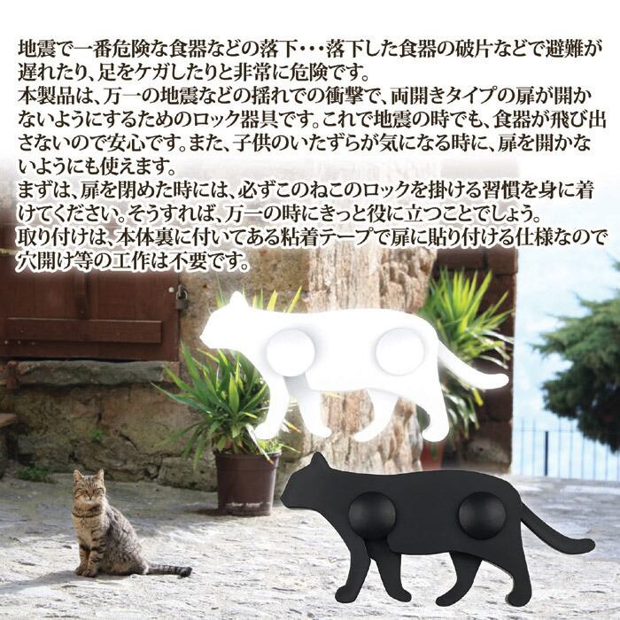 地震で一番危険な食器などの落下・・・落下した食器の破片などで避難が遅れたり、足をケガしたりと非常に危険です。本製品は、万一の地震などの揺れでの衝撃で、両開きタイプの扉が開かないようにするためのロック器具です。これで地震の時でも、食器が飛び出さないので安心です。また、子供のいたずらが気になる時に、扉を開かないようにも使えます。まずは、扉を閉めた時には、必ずこのねこのロックを掛ける習慣を身に着けてください。そうすれば、万一の時にきっと役に立つことでしょう。取り付けは、本体裏に付いてある粘着テープで扉に貼り付ける仕様なので、穴開け等の工作は不要です。