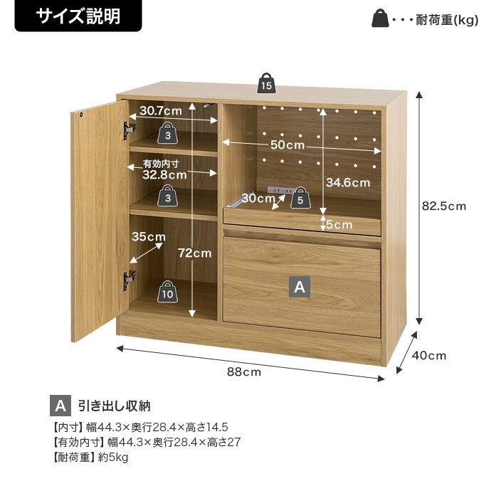 【耐荷重】天板:約15kg、スライドトレー:約5kg、引き出し収納:約5kg、扉収納・可動棚:約3kg、扉収納・底板:約10kg