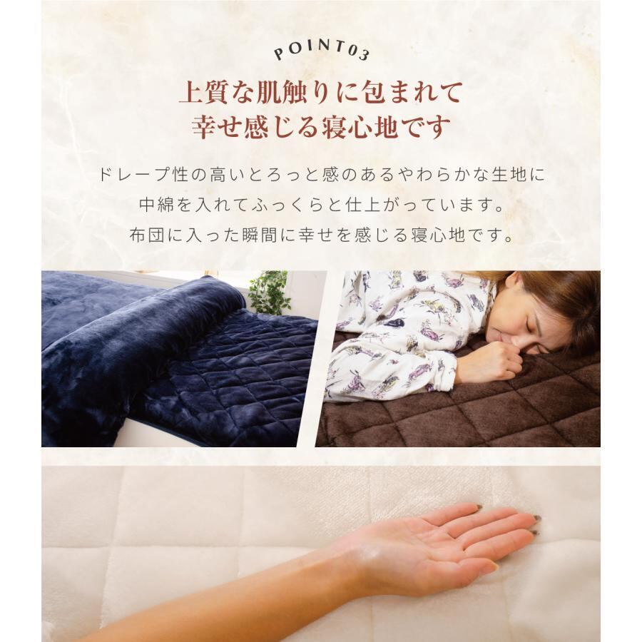 ふわふわなめらかな毛布の下で感じる適度なクッション感をお確かめください。
