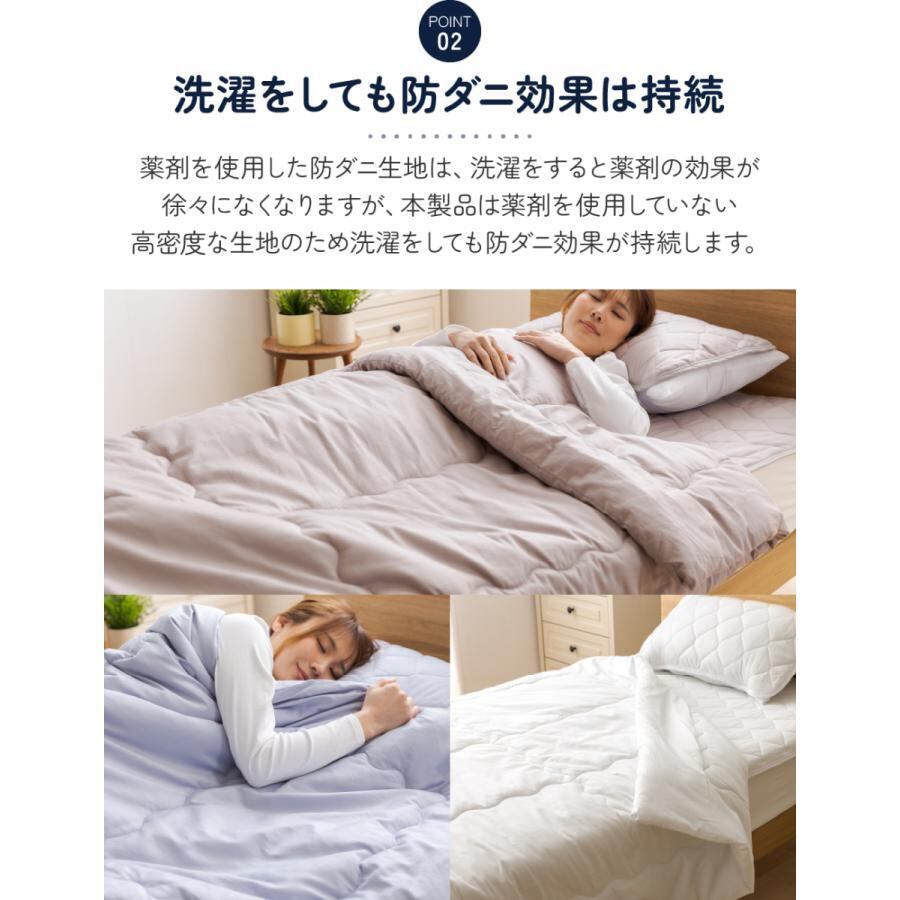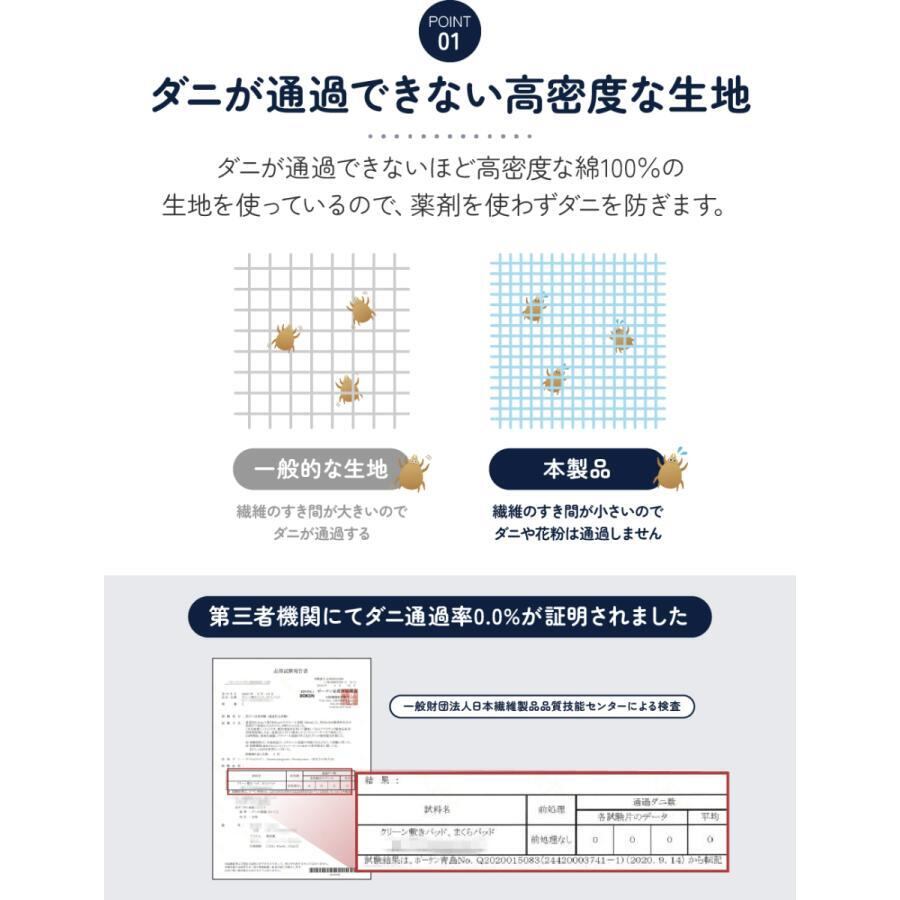 綿なのにダニ通過ゼロの生地なので肌にもやさしい寝具です。一般的なダニを通さない生地はポリエステルなどの化学繊維の高密度にしたものを使用した製品が多いのですが