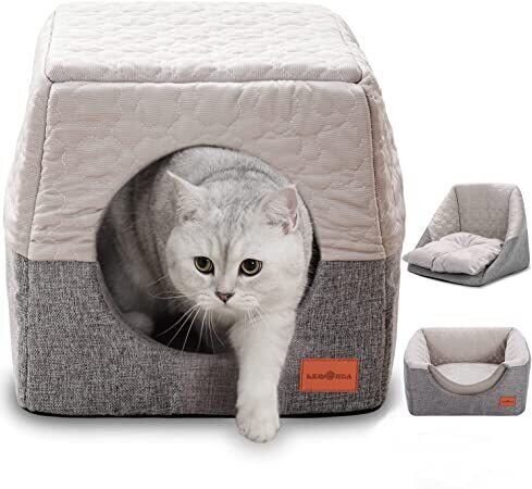 ☁【2WAYドーム型・四季通用】:ドーム型&クッション型の2WAY仕様で、1年中お使いいただけます。トップは肌に優しい冷感材質を採用し、天井の四つの角を押し込めば、お気楽にペットソファーに転換できます。身を隠せる場所が欲しいネコちゃん、ふかふかクッションが欲しいネコちゃん、どちらの要望も叶えるベッドです。